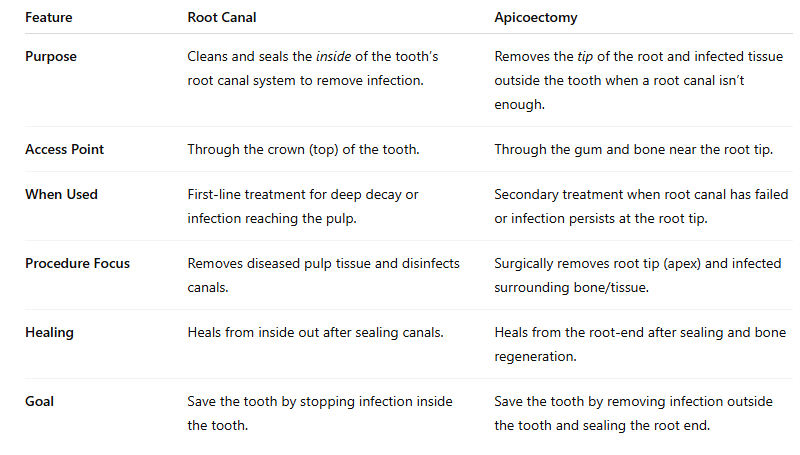 An apicoectomy works from the outside of the tooth, targeting the root tip directly.